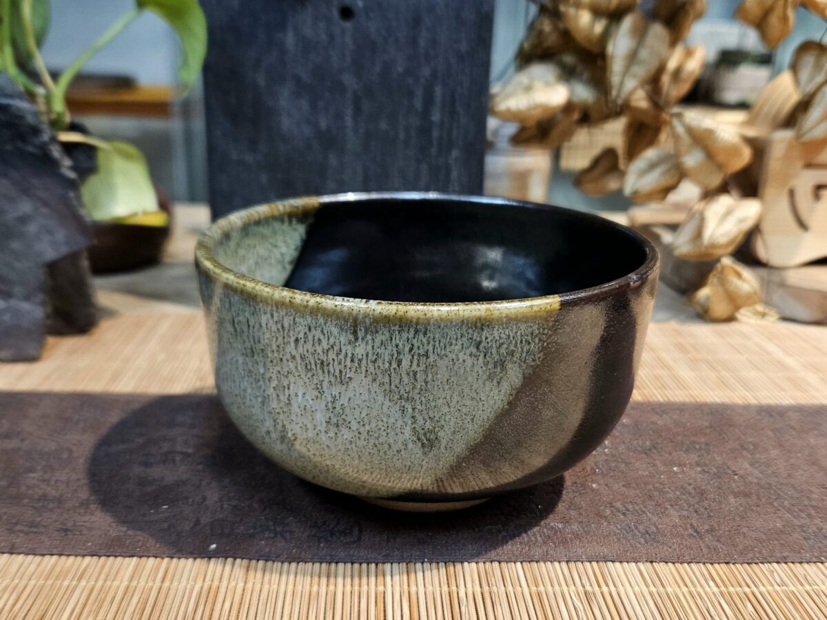 Ez a kézzel készült chawan egy klasszikus teás csésze, amely a wabi–sabi esztétika nyugalmát hordozza. A tál mély, fényes fekete alapmáza találkozik egy halvány kékeszöld, a peremén borostyán – kissé a tenmoku stílusra emlékeztető – réteggel, mintha a chawant csak megmerítették volna benne. A két máz természetes átmenete organikus mintázatot hoz létre – akár a sötét éjszakából a hajnali égre nyíló ablak . Hagyományos alakú, Han Tsutsu-Gata (félhenger) chawan.