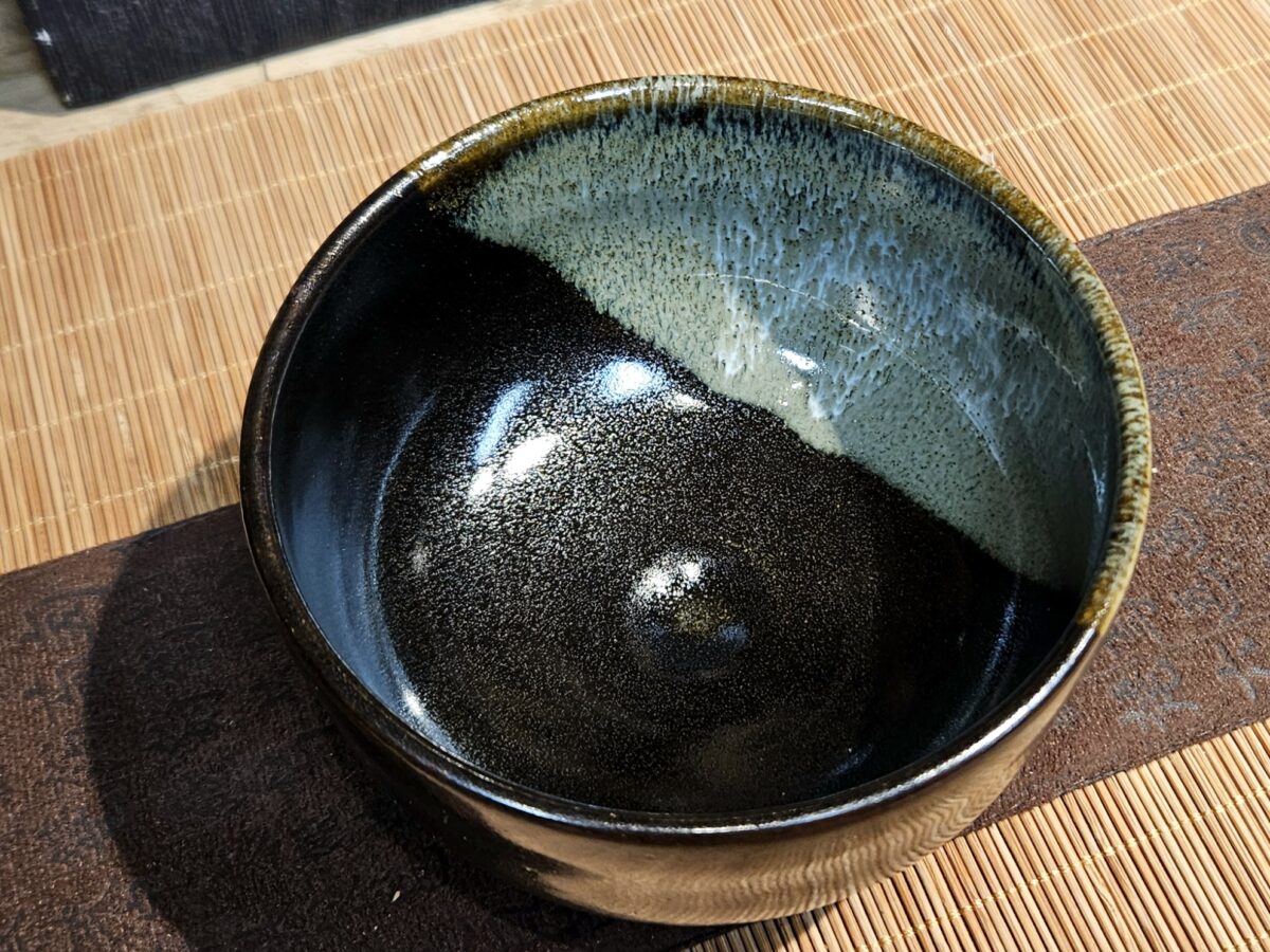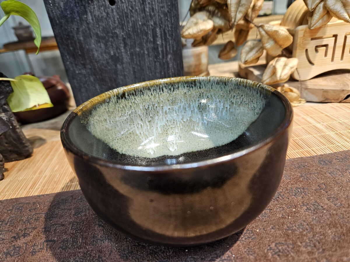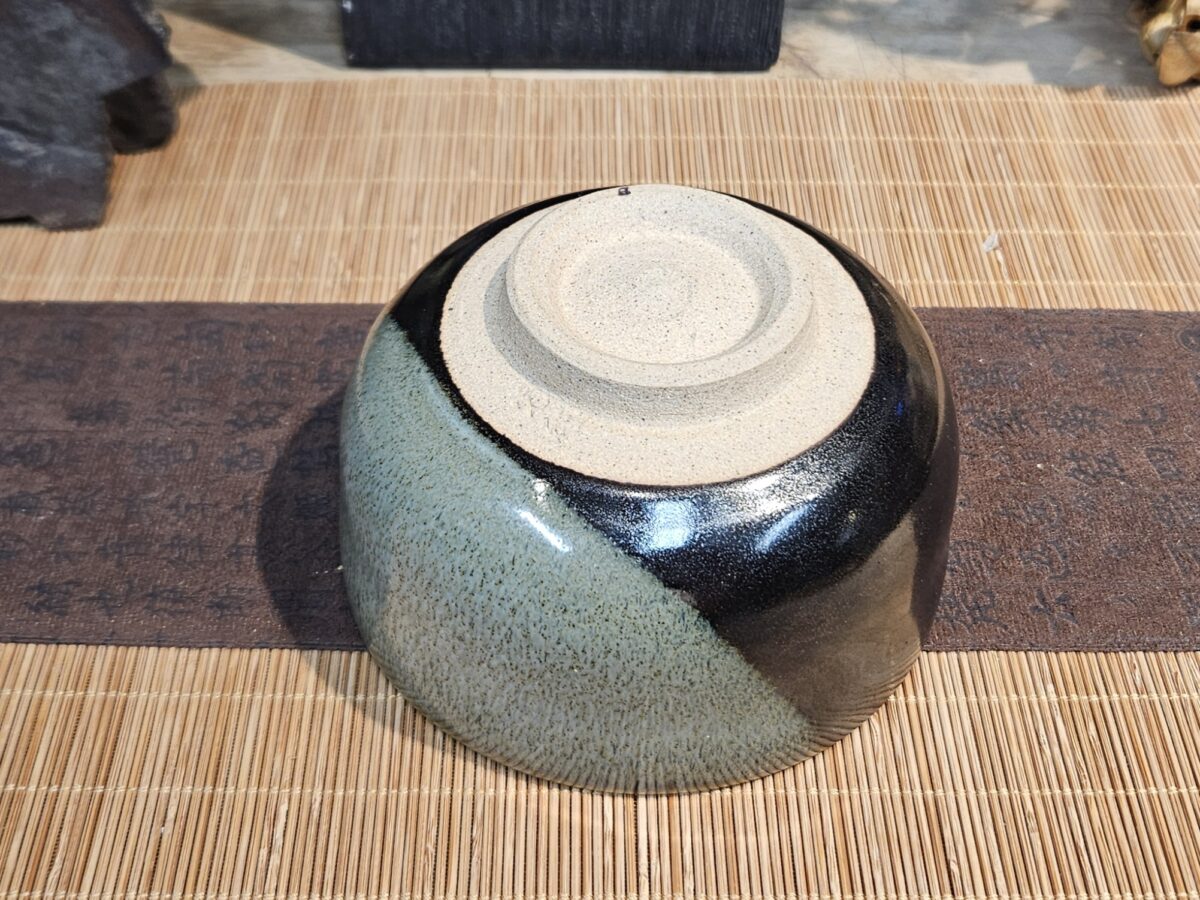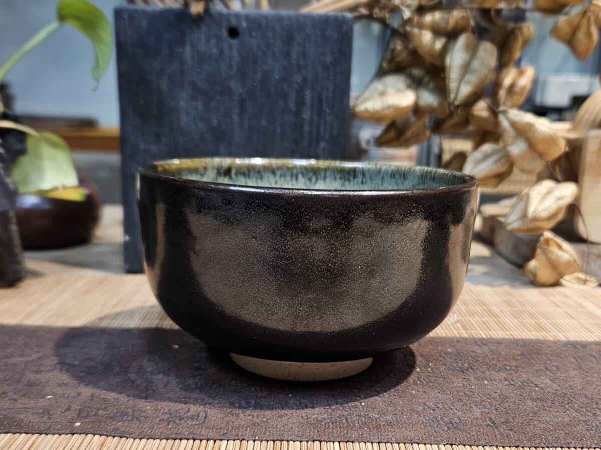 Ez a kézzel készült chawan egy klasszikus teás csésze, amely a wabi–sabi esztétika nyugalmát hordozza. A tál mély, fényes fekete alapmáza találkozik egy halvány kékeszöld, a peremén borostyán – kissé a tenmoku stílusra emlékeztető – réteggel, mintha a chawant csak megmerítették volna benne. A két máz természetes átmenete organikus mintázatot hoz létre – akár a sötét éjszakából a hajnali égre nyíló ablak . Hagyományos alakú, Han Tsutsu-Gata (félhenger) chawan.