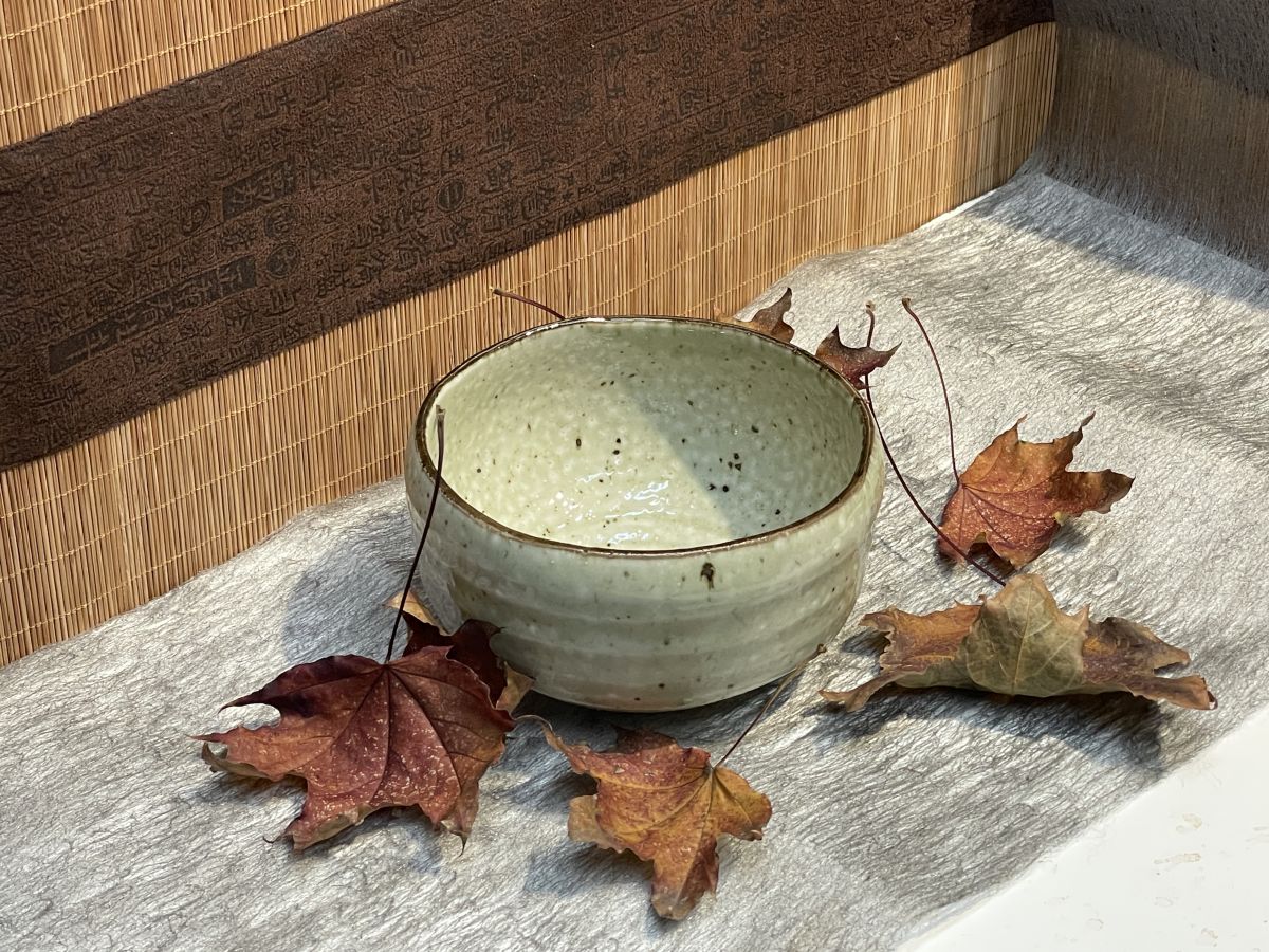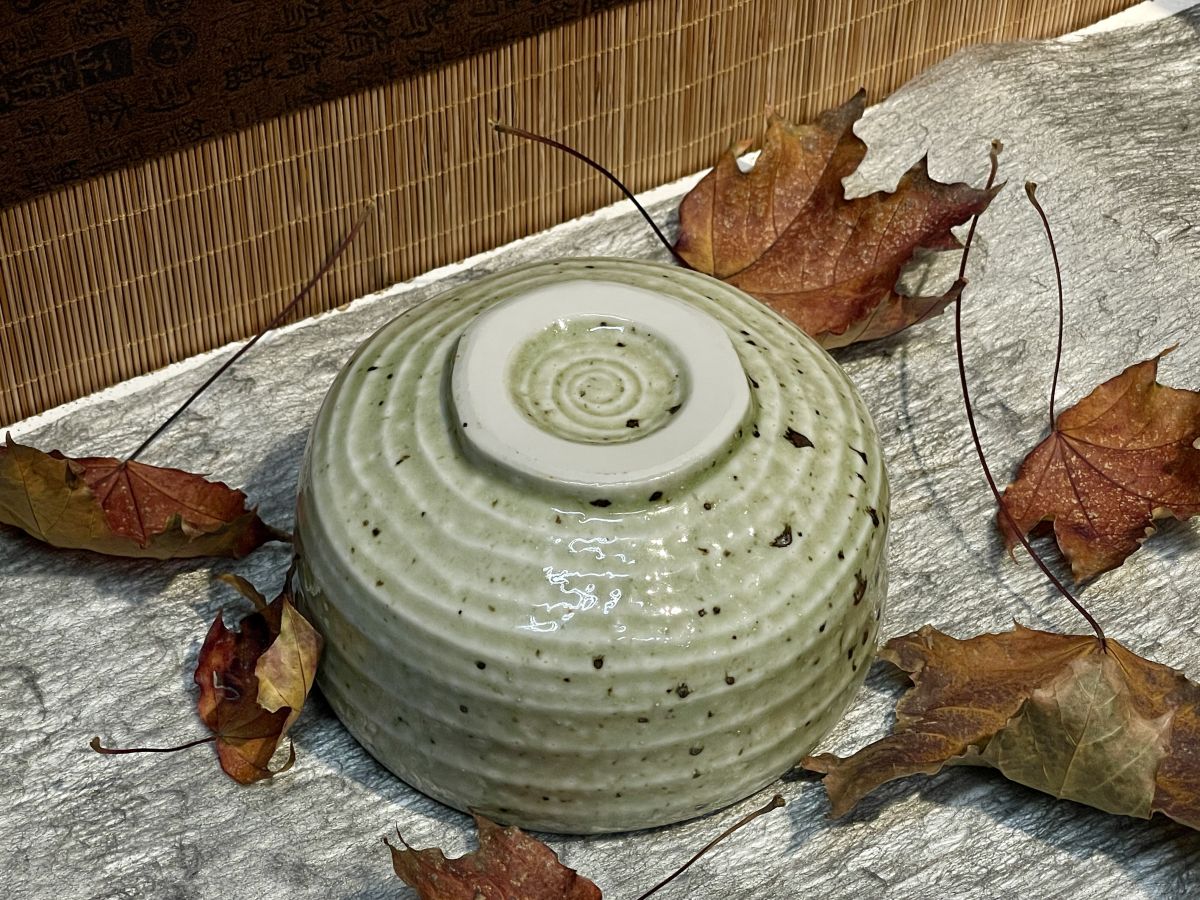 Halvány oliva zöld, pettyezett felületű, mázas Minoyaki chawan mennyiség