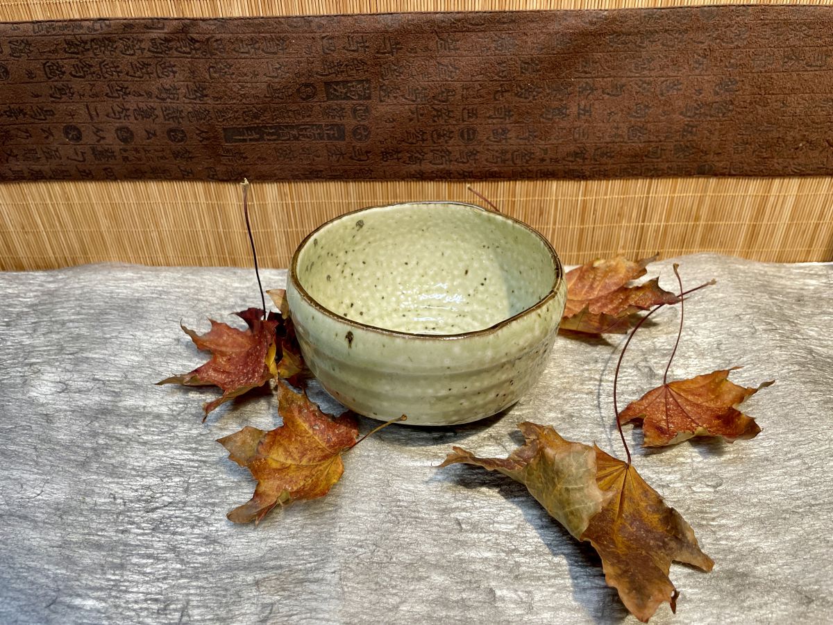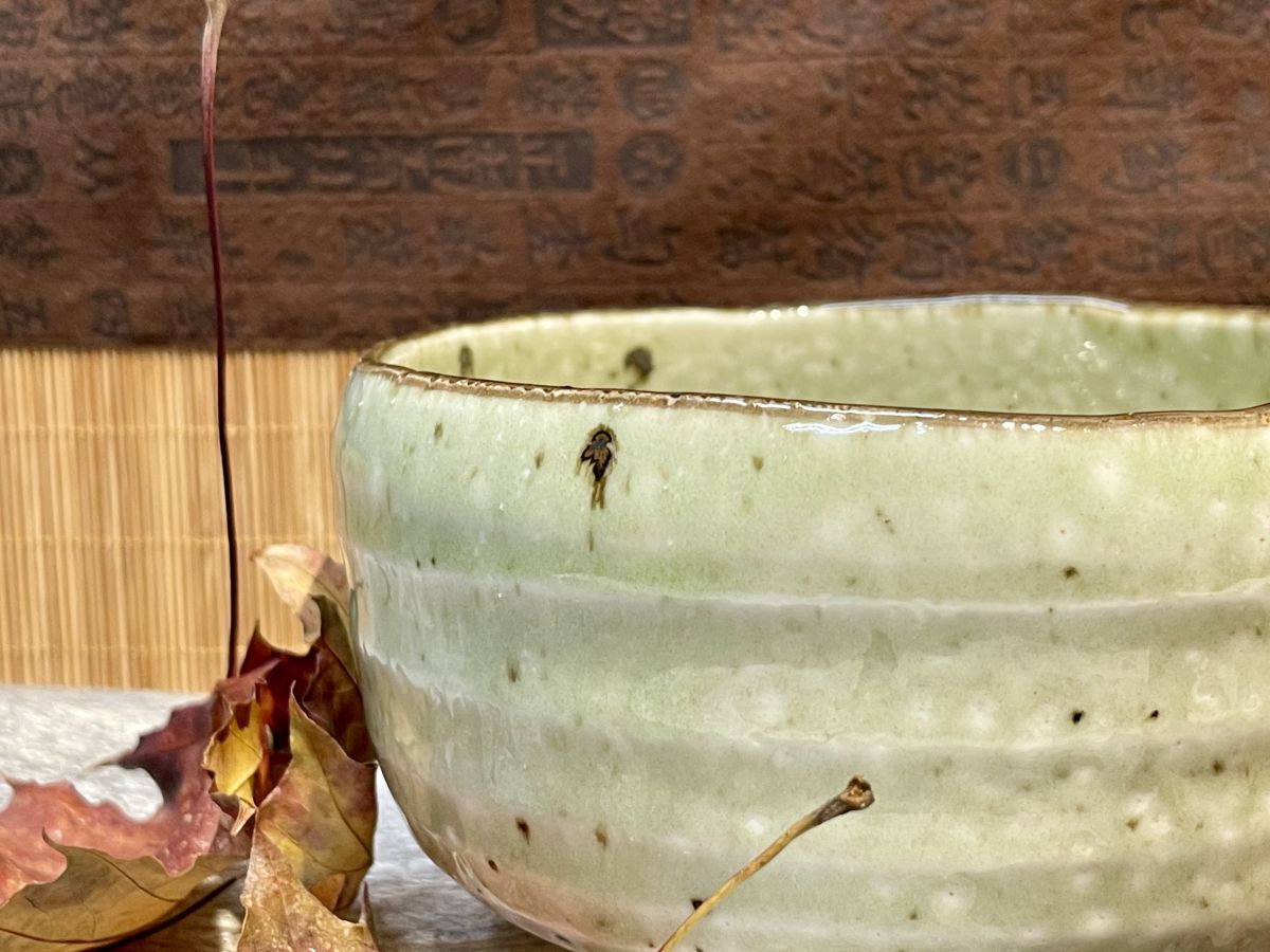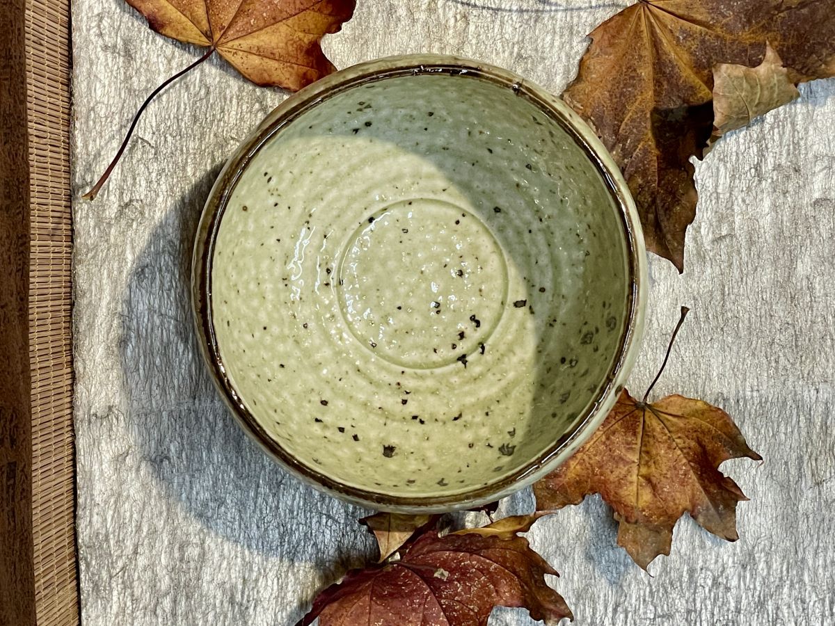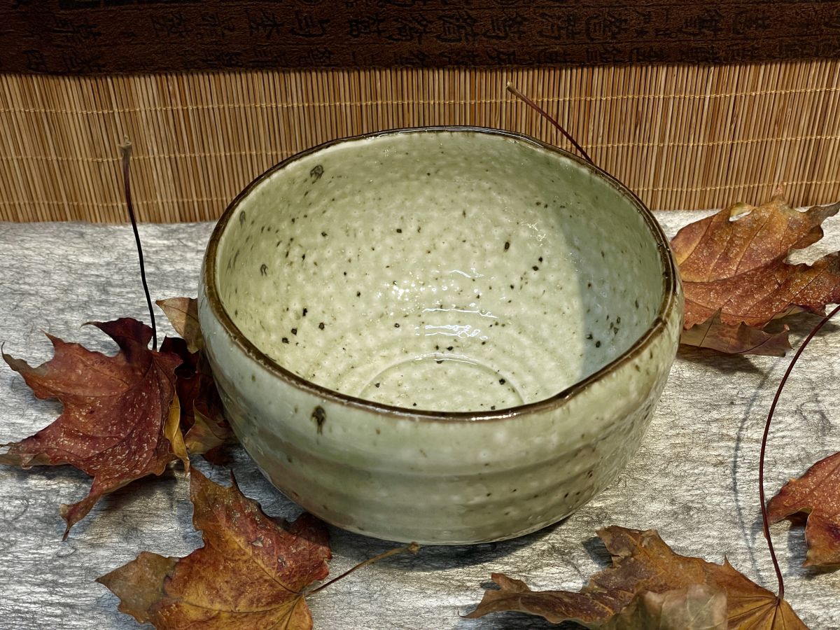 / Halvány oliva zöld, pettyezett felületű, mázas Minoyaki chawan