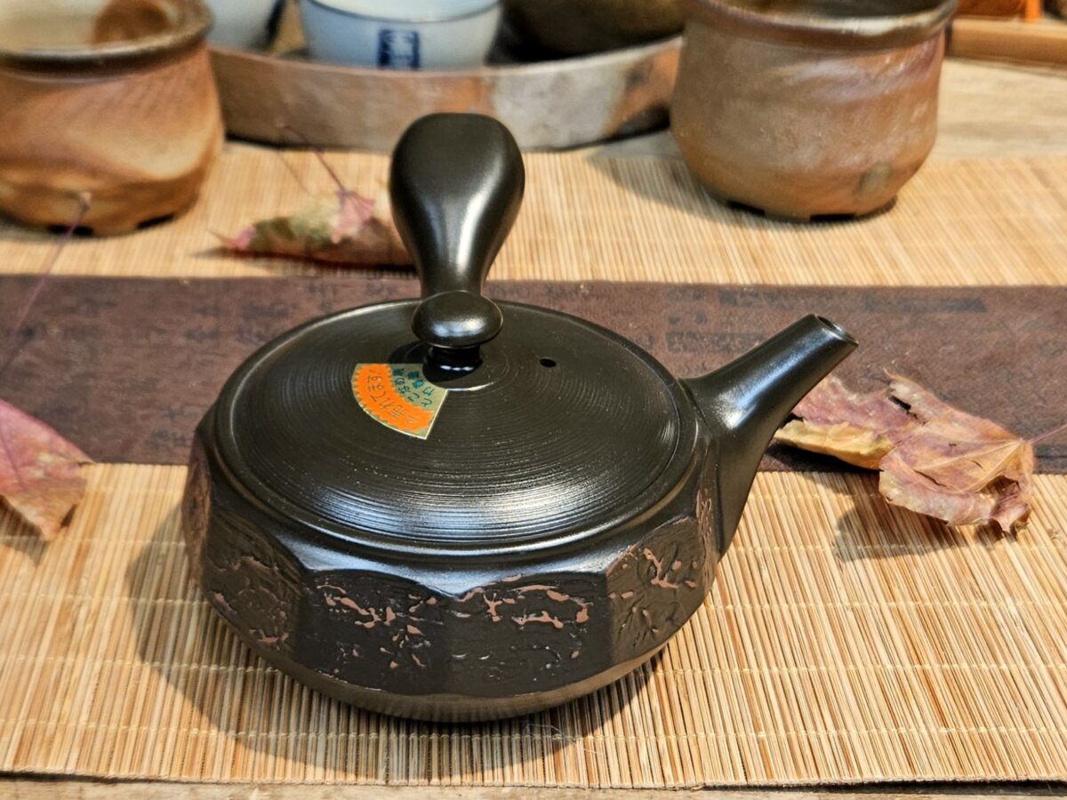 Vésett oldalfalú, izzó parázs hangulatát keltő, gyorsan töltő Tokoname kyusu kanna.