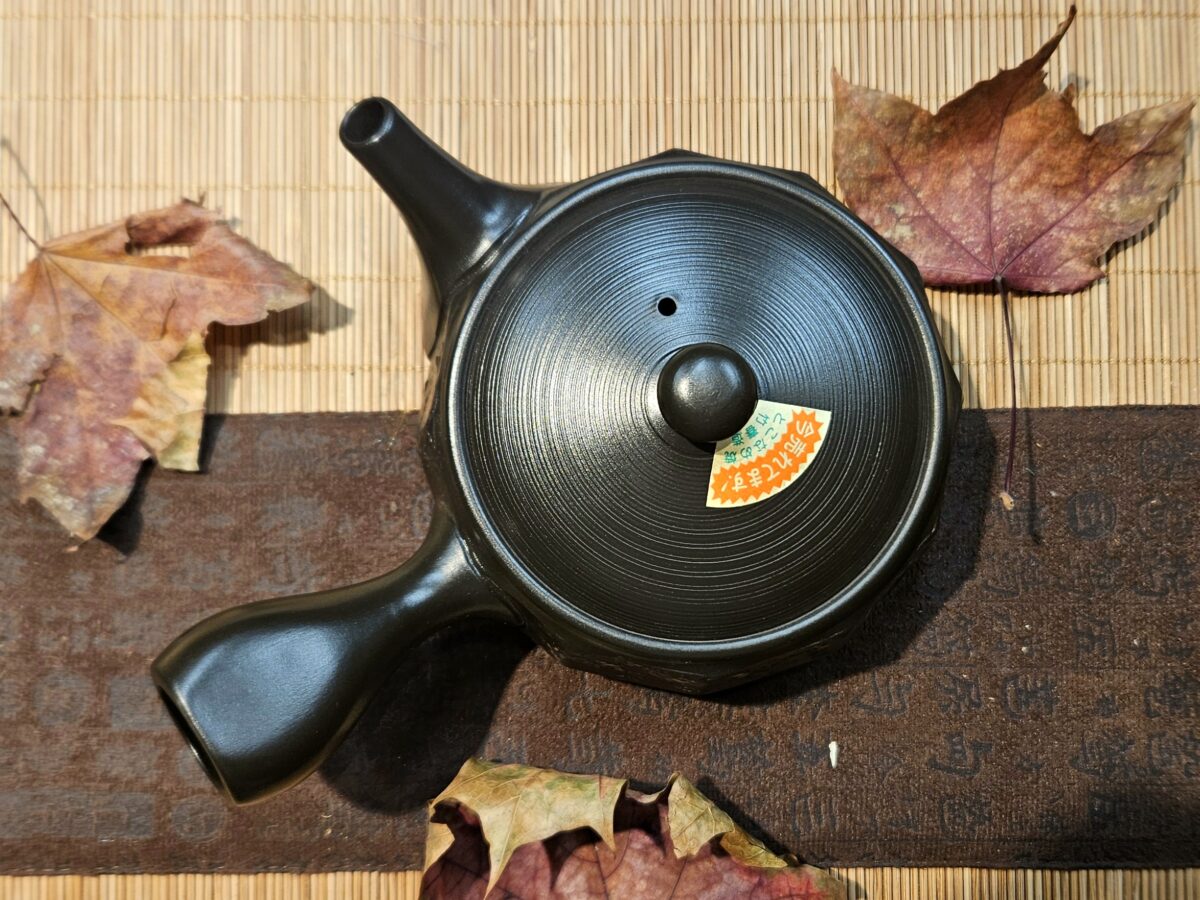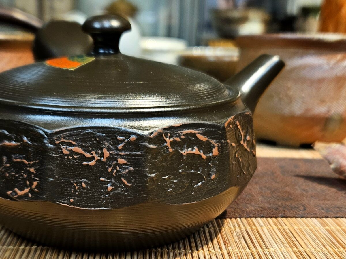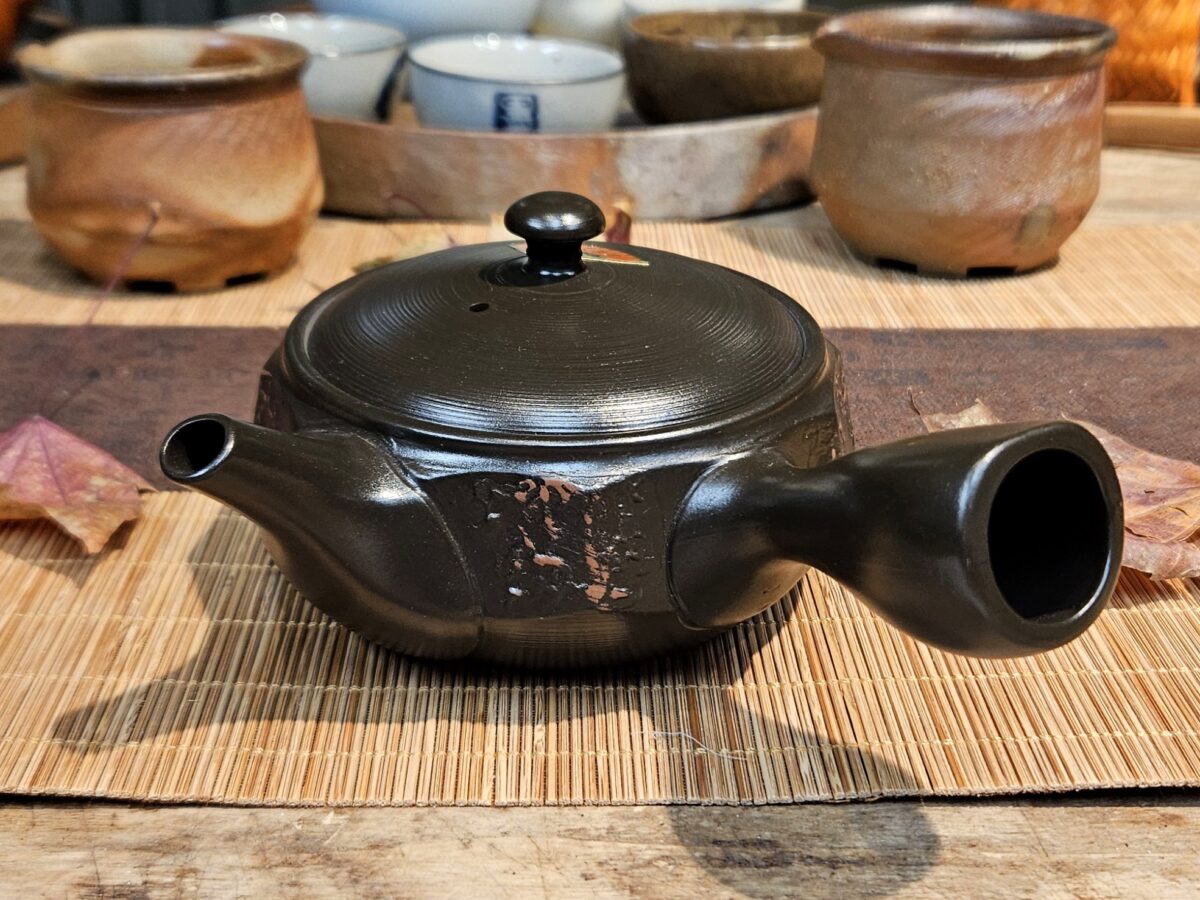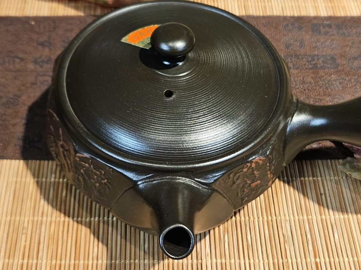 Vésett oldalfalú, izzó parázs hangulatát keltő, gyorsan töltő Tokoname kyusu kanna.
