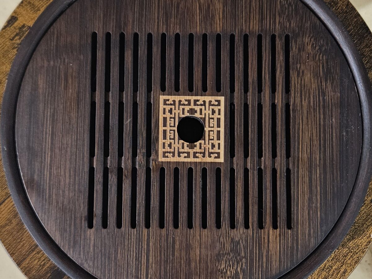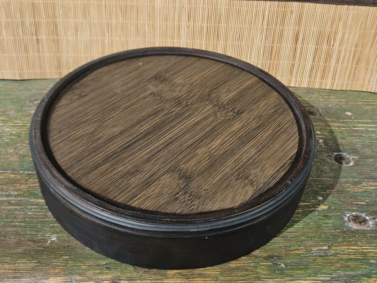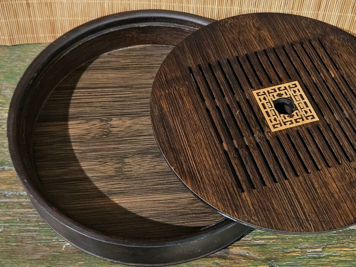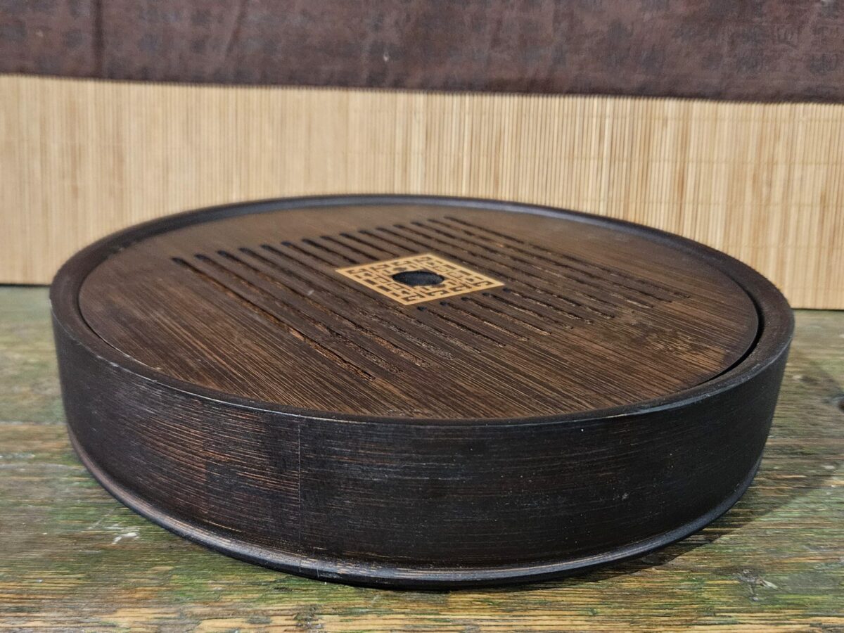 Kis méretű, kerek, sötétbarnára pácolt bambusz teatálca.