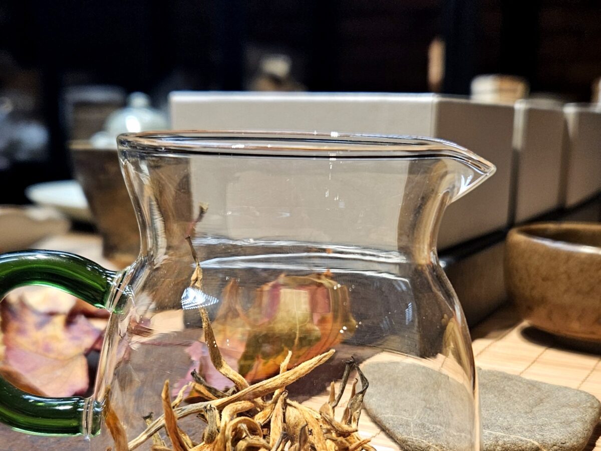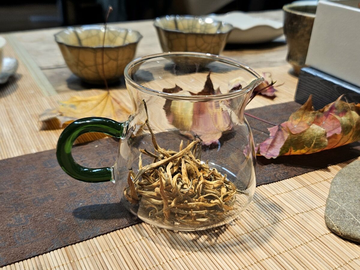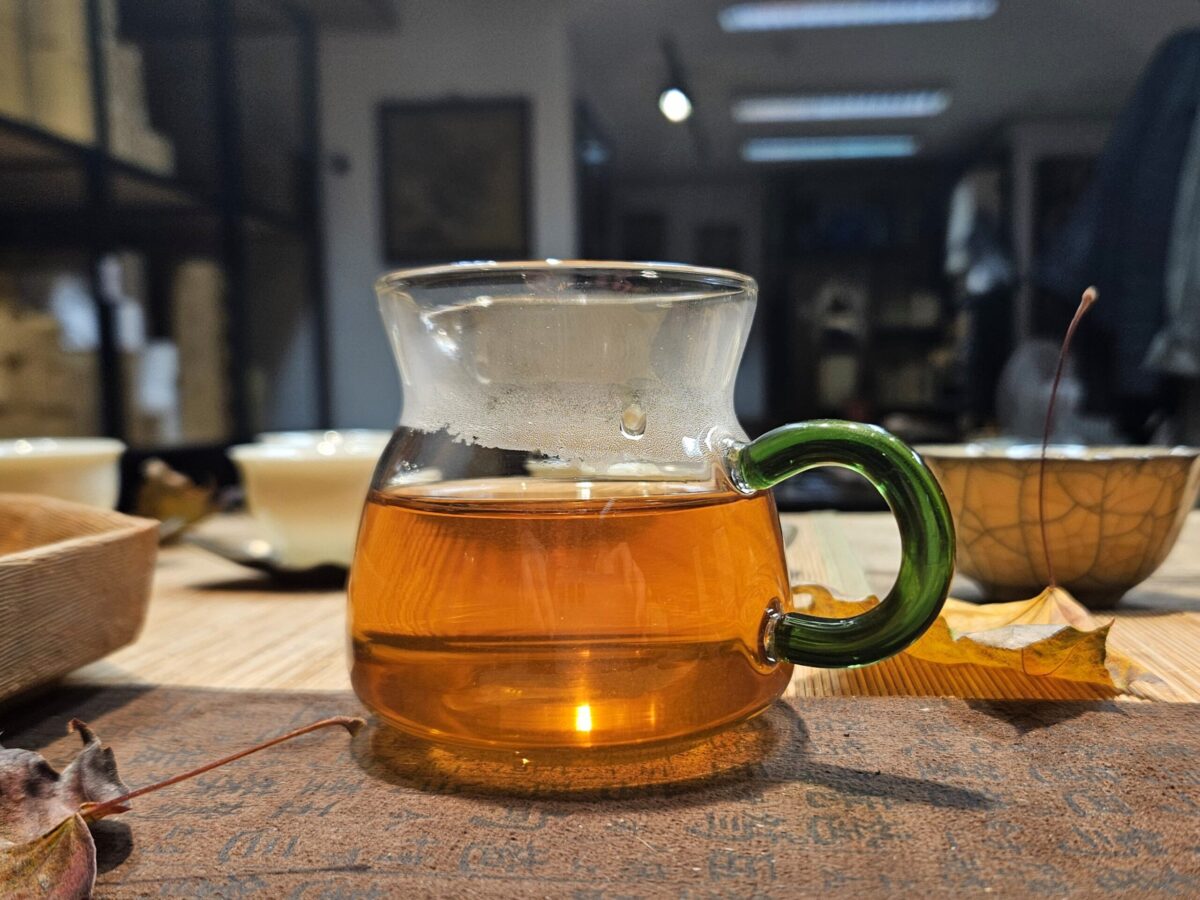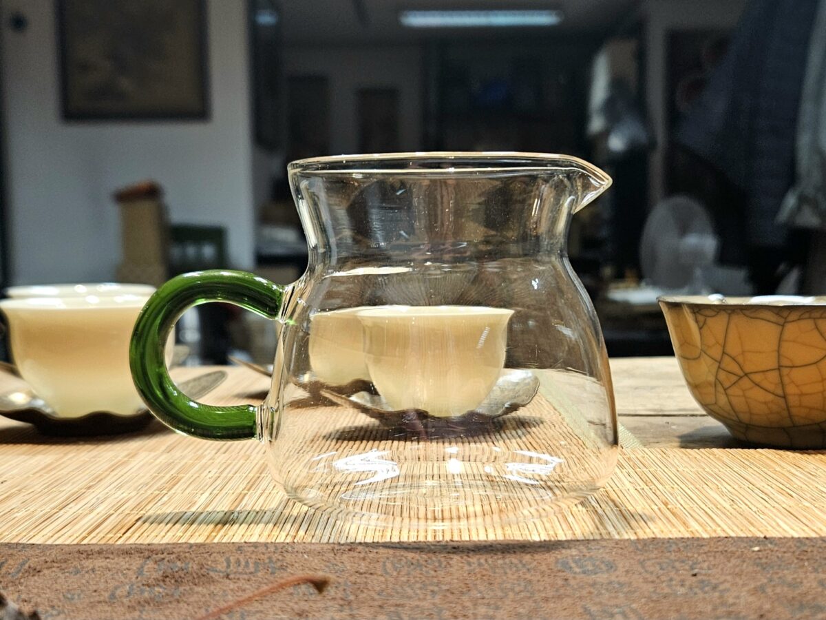 Zöld fogantyús, stabil kiállású, kis méretű üvegkiöntő, 250ml-es űrtartalmú, majdnem tele töltve.